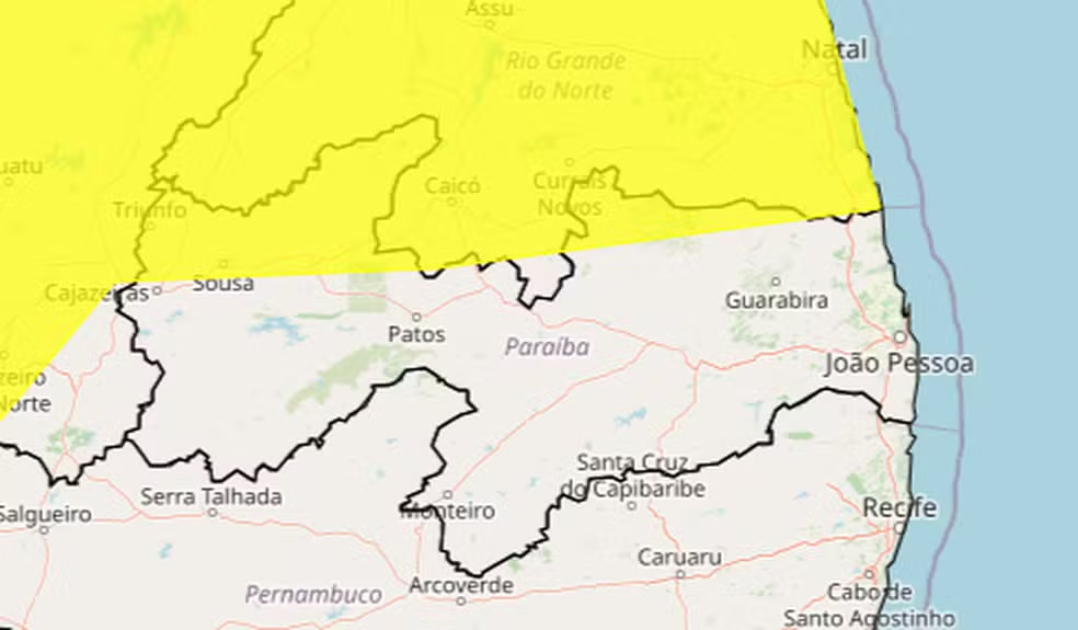 O Instituto Nacional de Meteorologia (Inmet) atualizou neste domingo (15) um alerta amarelo de chuvas intensas, que vale para 56 municípios da Paraíba. O aviso permanece ativo até as 23h59 do mesmo dia, indicando a possibilidade de chuvas fortes e ventos moderados a intensos na região.